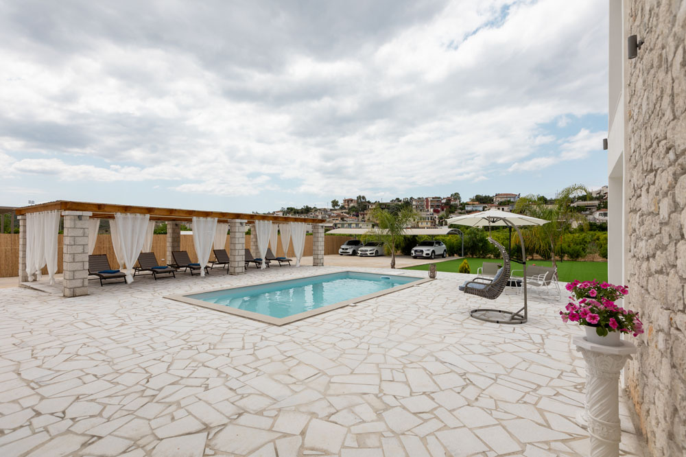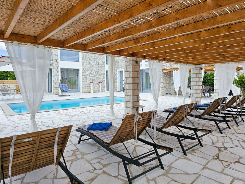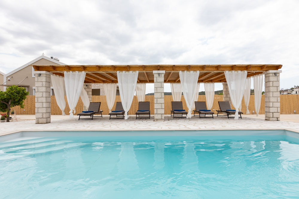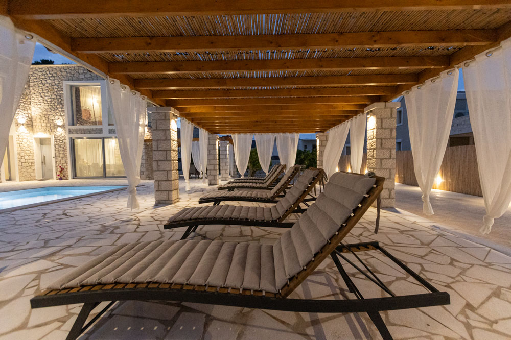 Πέτρινες πέργκολες με ξαπλώστρες και εξωτερική τραπεζαρία