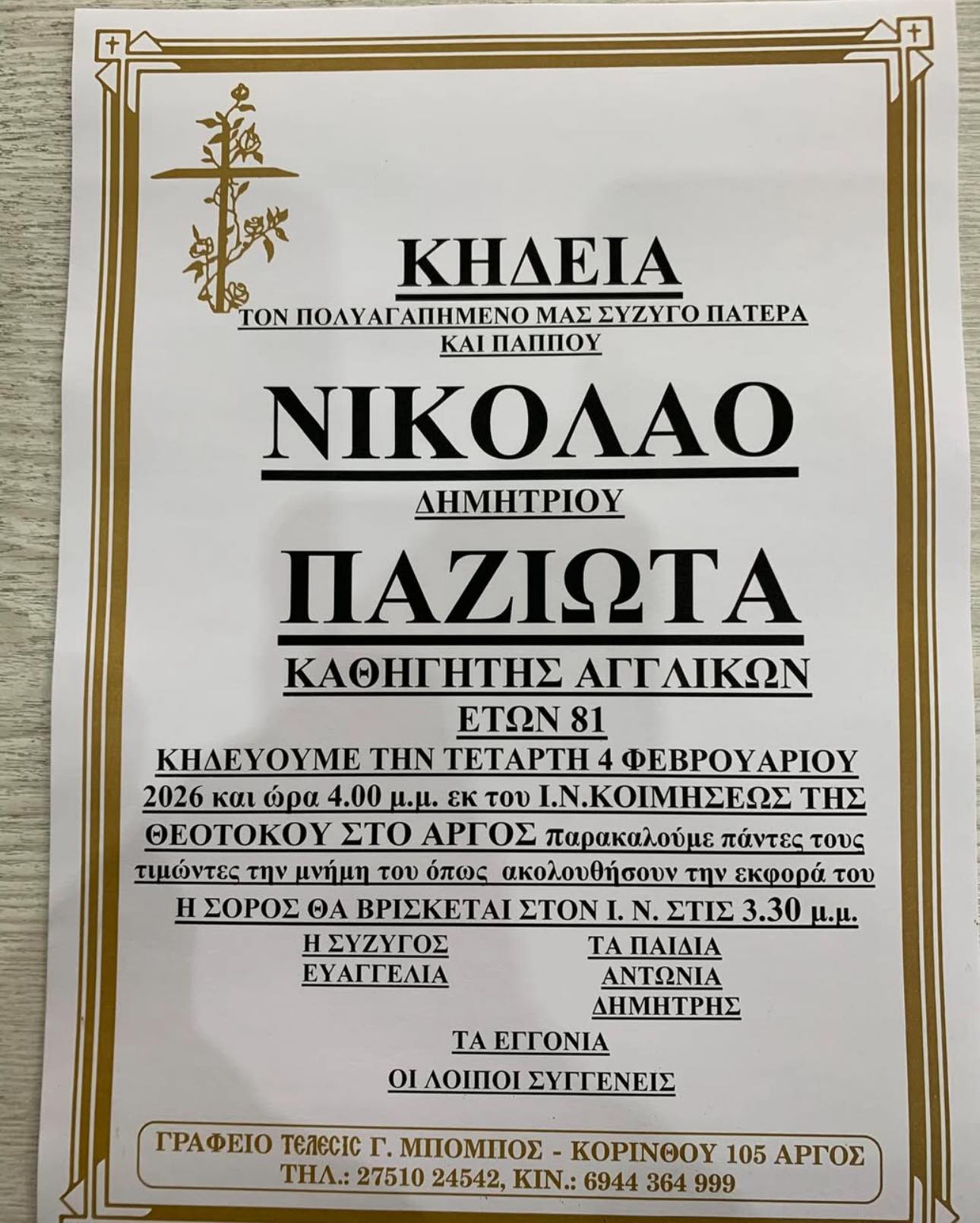 Θλίψη και συγκίνηση έχει προκαλέσει στην τοπική κοινωνία του Άργους η είδηση του θανάτου του Νικολάου Παζιώτα, γνωστού και ιδιαίτερα αγαπητού καθηγητή Αγγλικών, ο οποίος έφυγε από τη ζωή σε ηλικία 81 ετών.