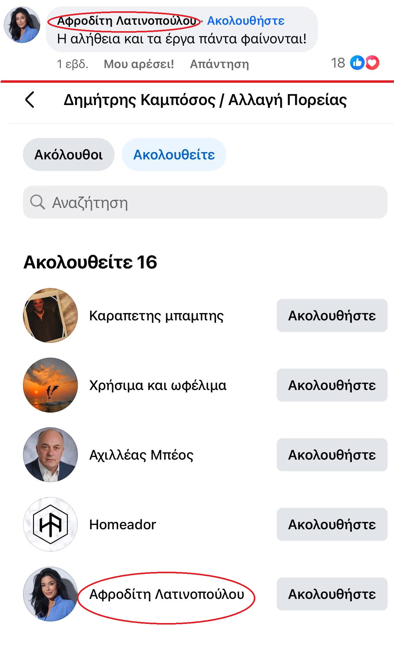 Αξίζει να σημειωθεί επίσης, πως η επίσημη σελίδα της δημοτικής παράταξης του κ. Καμπόσου στο facebook, από γνωστά πολιτικά πρόσωπα της χώρας ακολουθεί μόνο τον Δήμαρχο Βόλου Αχιλλέα Μπέο και την Αφροδίτη Λατινοπούλου.
