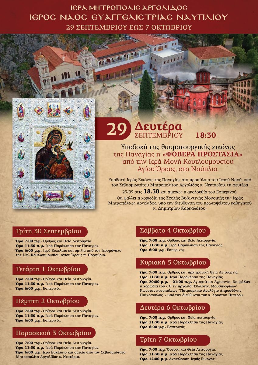 Τη Δευτέρα 29 Σεπτεμβρίου 2025, στις 6:30 το απόγευμα, θα πραγματοποιηθεί στον Ιερό Ναό Ευαγγελιστρίας Ναυπλίου η επίσημη υποδοχή της Ιεράς Εικόνας της Παναγίας «Φοβερά Προστασία», η οποία μεταφέρεται από την Ιερά Μονή Κουτλουμουσίου του Αγίου Όρους.