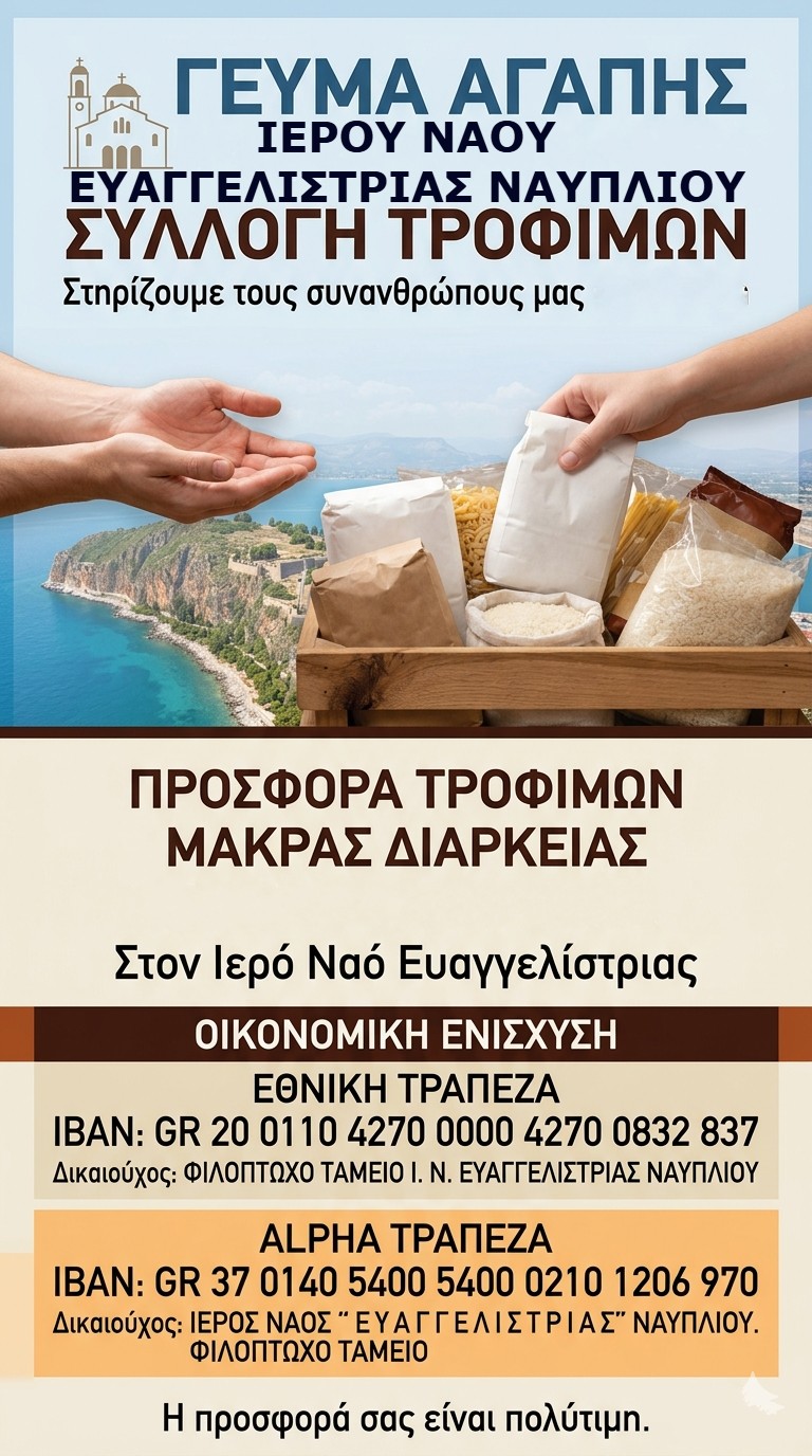Μέσα σε αυτό το κλίμα, ο Ιερός Ναός Ευαγγελίστριας Ναυπλίου απευθύνει ανοιχτό κάλεσμα προς τους πολίτες της Αργολίδας, με στόχο την ενίσχυση του καθημερινού «Γεύματος Αγάπης», που εδώ και χρόνια στηρίζει ανθρώπους που βρίσκονται σε ανάγκη.