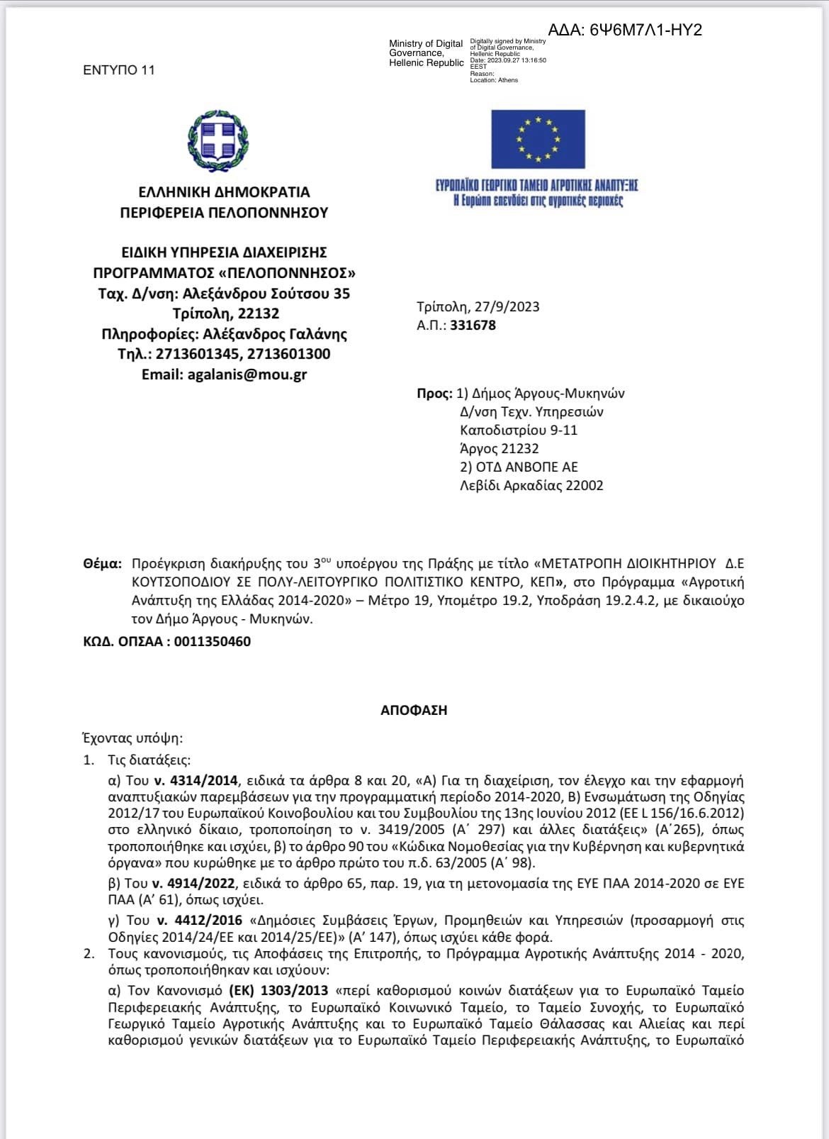 Εγκρίθηκε από το «Πρόγραμμα Αγροτικής Ανάπτυξης της Ελλάδας 2014-2020» το έργο με τίτλο «Μετατροπή του διοικητηρίου Δ.Ε. Κουτσοποδίου σε πολυλειτουργικό πολιτιστικό κέντρο, ΚΕΠ».
