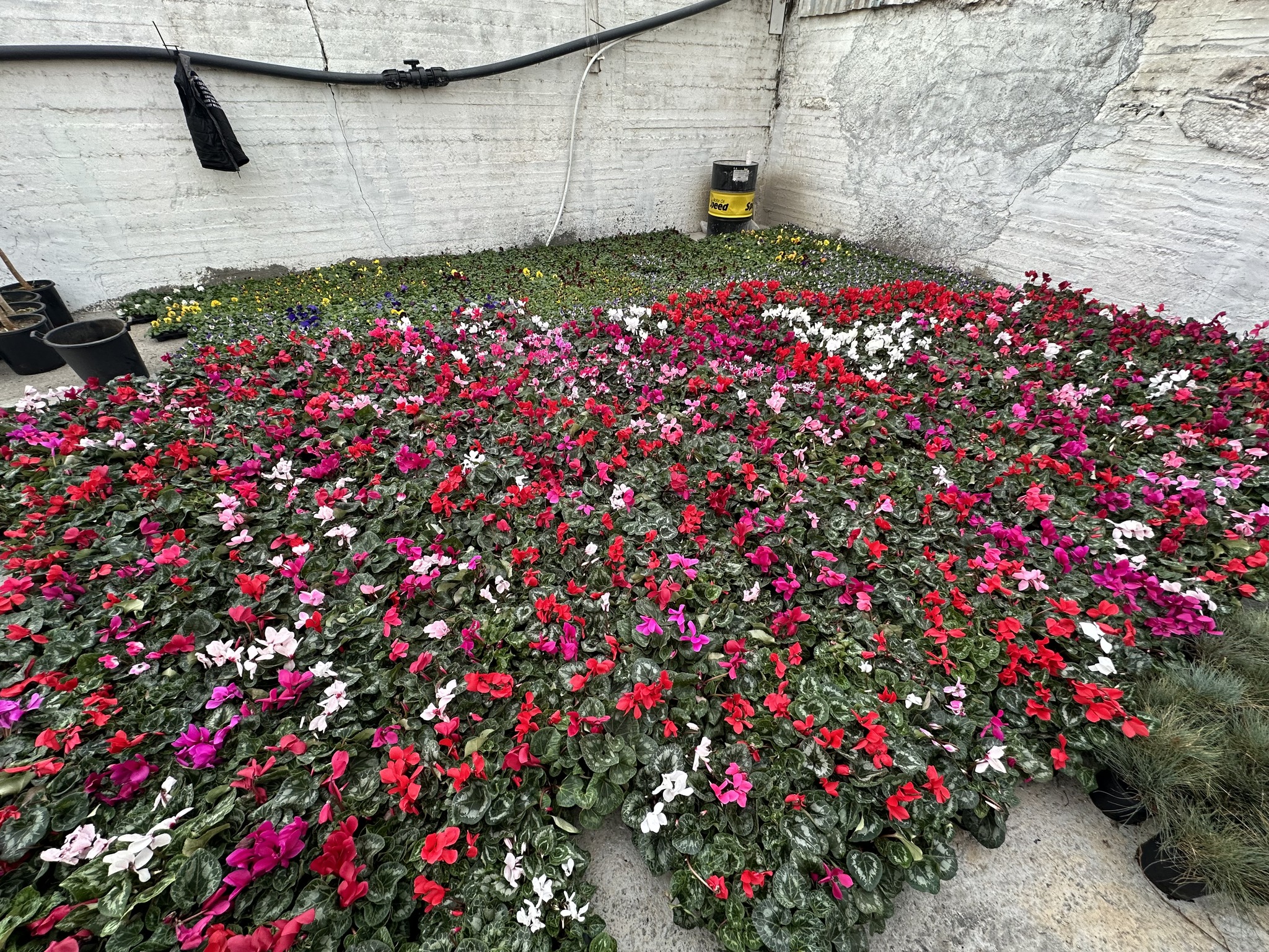 Εκατοντάδες μικρά καλλωπιστικά φυτά, όπως κυκλάμινα και πανσέδες.