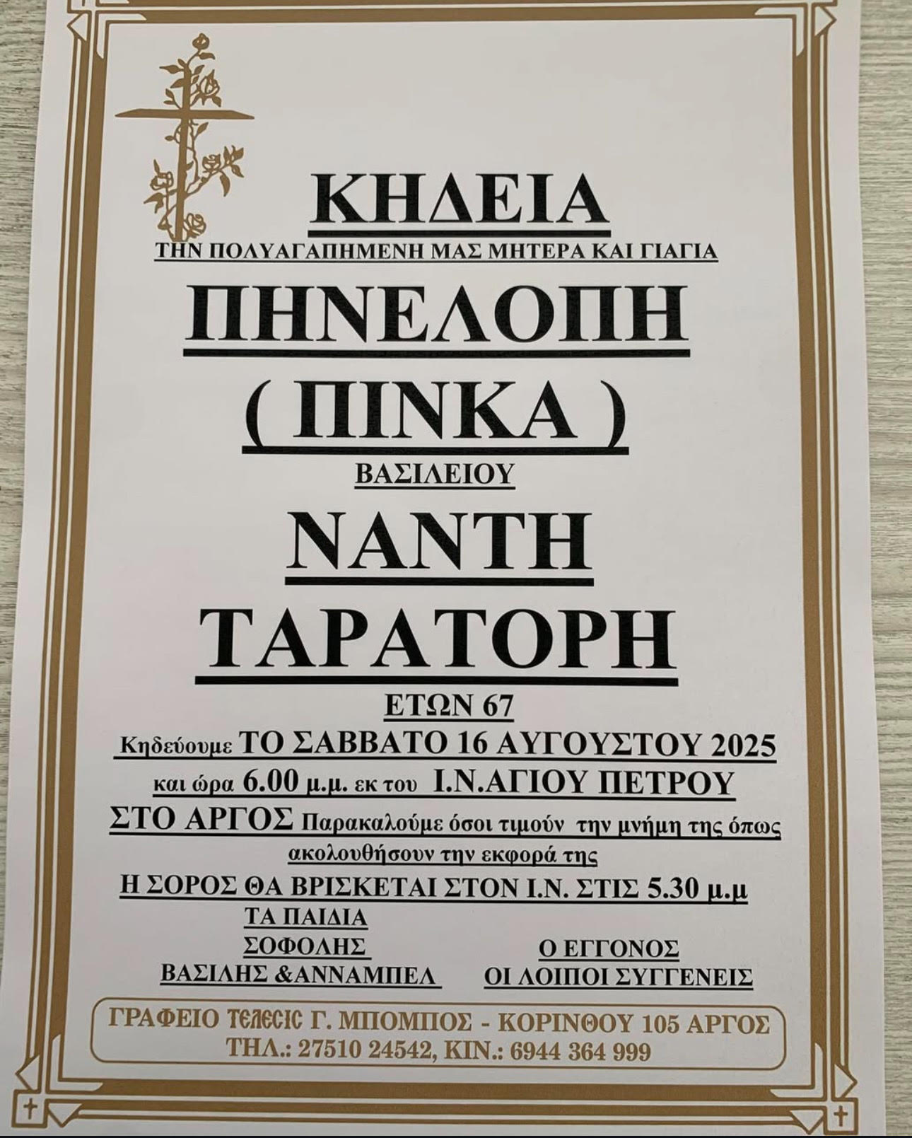 Η εξόδιος ακολουθία θα τελεστεί το Σάββατο 16 Αυγούστου 2025, στις 6:00 μ.μ., στον Ιερό Ναό Αγίου Πέτρου στο Άργος.