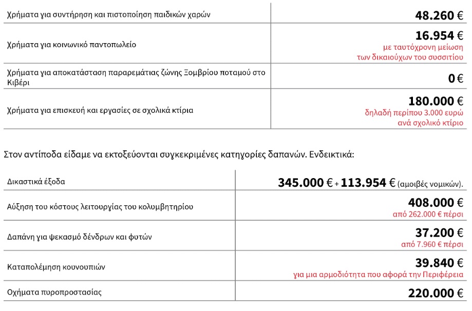 Ειδικότερα, γίνεται αναφορά σε περιορισμένες πιστώσεις για βασικούς τομείς, όπως η συντήρηση παιδικών χαρών (48.260 ευρώ), το κοινωνικό παντοπωλείο (16.954 ευρώ, με παράλληλη μείωση δικαιούχων), η παραρεμάτια ζώνη του Ξομβρίου στο Κιβέρι (μηδενική πρόβλεψη) και οι επισκευές σχολικών κτιρίων (180.000 ευρώ συνολικά).