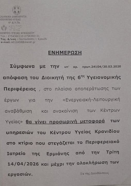 Με απόφαση του Διοικητή της 6ης Υγειονομικής Περιφέρειας, προχωρά η προσωρινή μεταφορά των υπηρεσιών του Κέντρου Υγείας Κρανιδίου στο κτίριο του Περιφερειακού Ιατρείου Ερμιόνης, στο πλαίσιο των εργασιών για την ενεργειακή και λειτουργική αναβάθμιση της μονάδας.