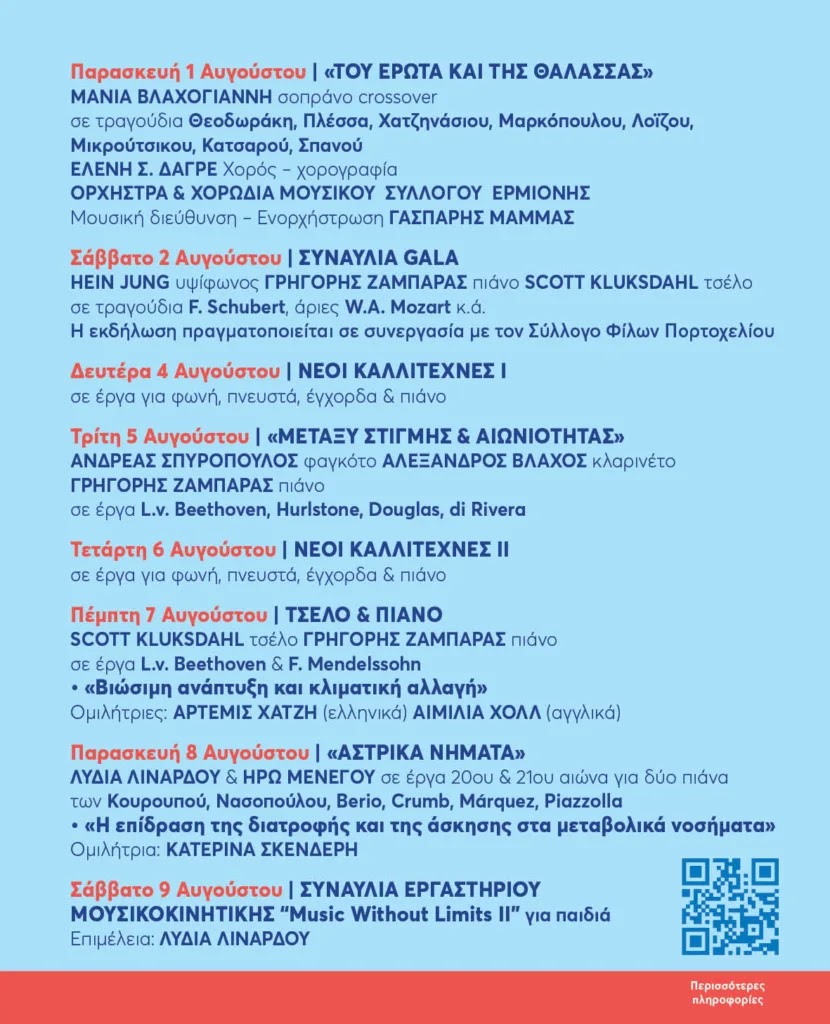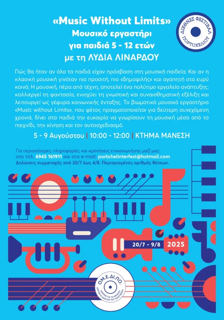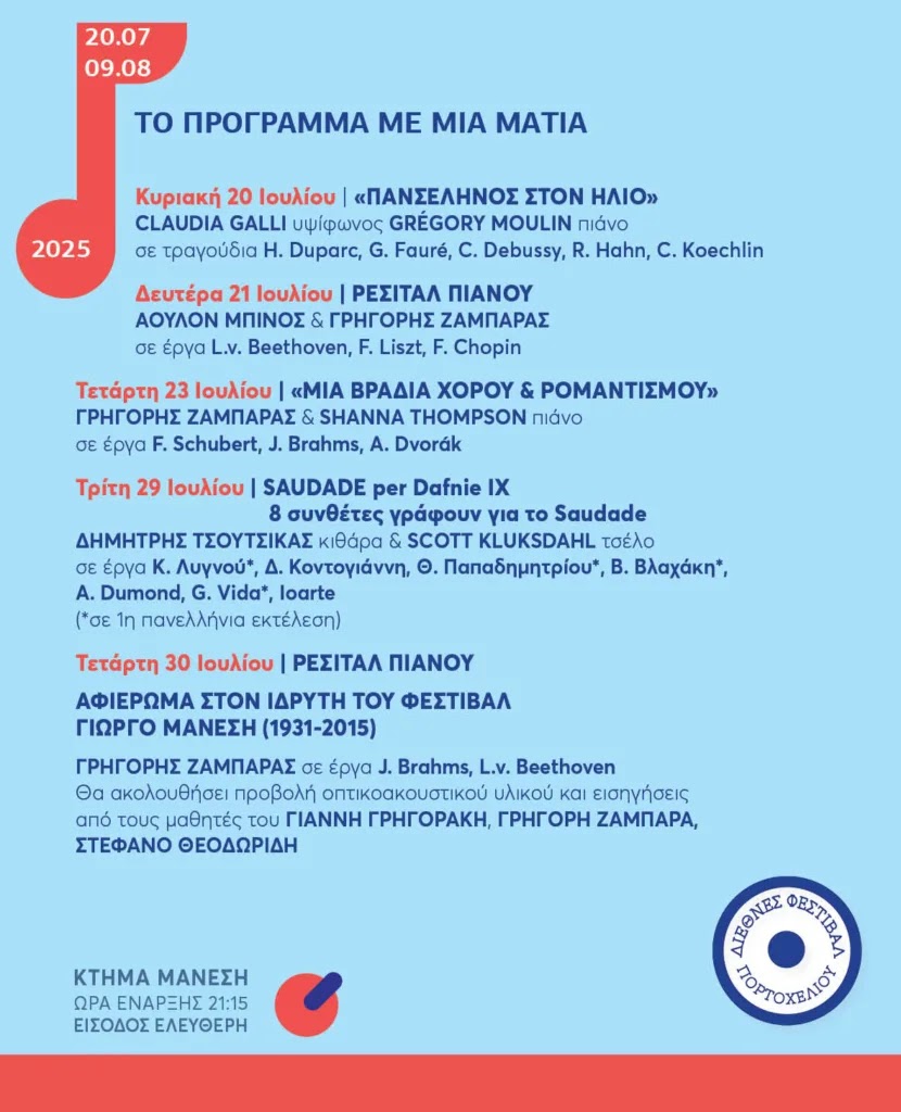 Για 37η χρονιά πραγματοποιείται φέτος το Φεστιβάλ Πορτοχελίου, ένας κορυφαίος θεσμός για την τέχνη και τον πολιτισμό, με επίκεντρο το κτήμα “Μάνεση” στο Πόρτο Χέλι. Οι εκδηλώσεις ξεκίνησαν στις 20 Ιουλίου και θα διαρκέσουν έως τις 9 Αυγούστου, προσφέροντας πλούσιο καλλιτεχνικό και εκπαιδευτικό πρόγραμμα.