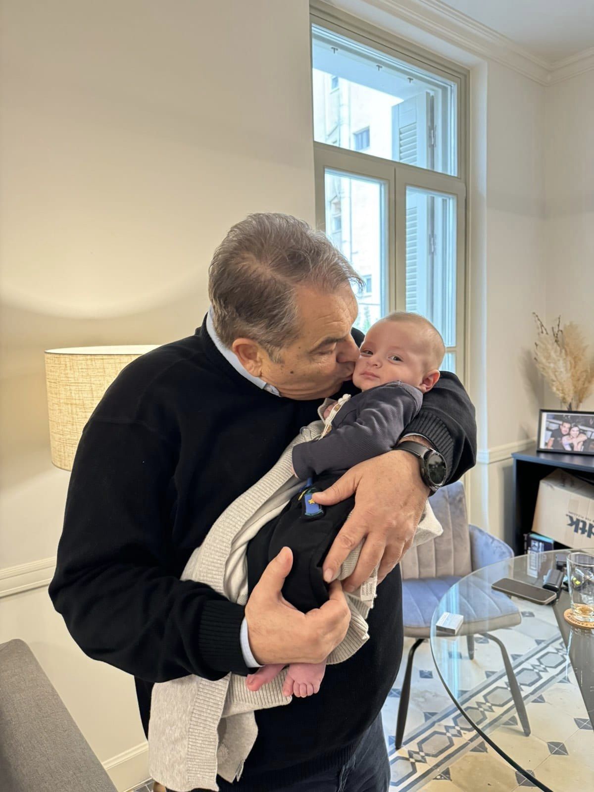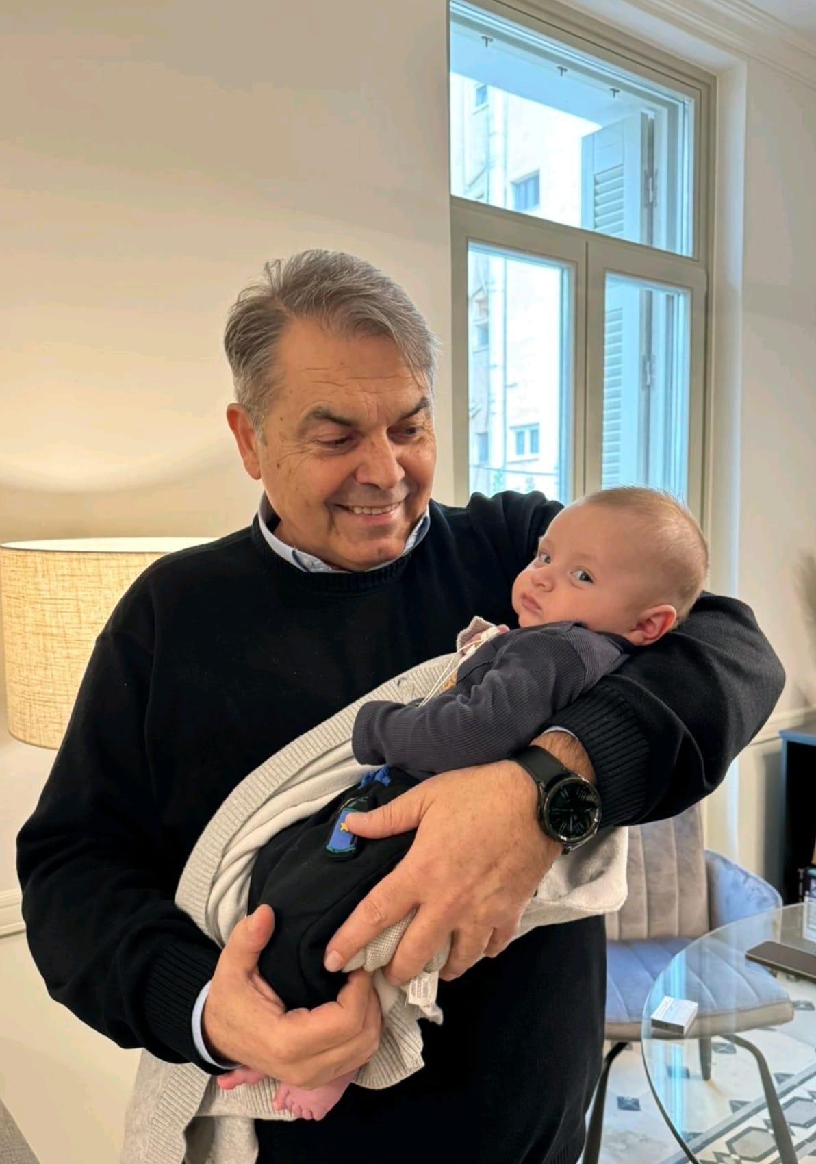 Ο κ. Καμπόσος, εμφανώς ευτυχισμένος, απεικονίζεται με τον τριών μηνών κούκλο εγγονό του στην αγκαλιά του.