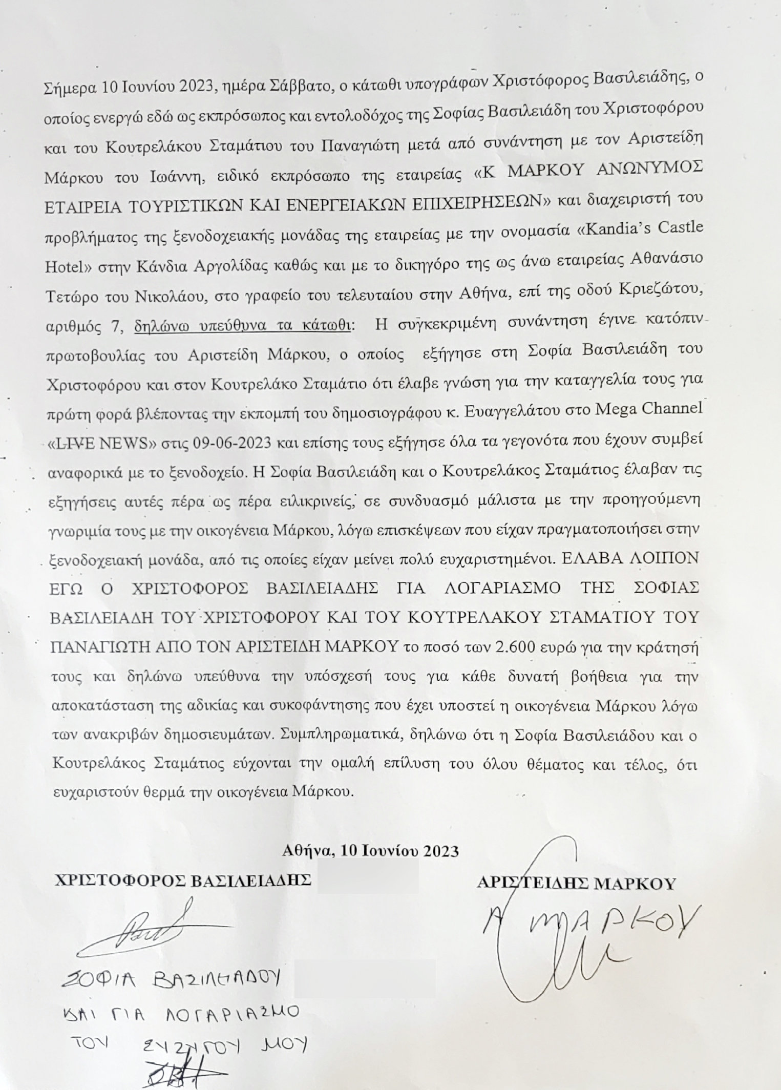 Στην εξέλιξη των γεγονότων μετά τη δημοσιοποίηση της καταγγελίας της Σοφίας Βασιλειάδου, ο πρώην ιδιοκτήτης του Kandia’s Castle, Άρης Μάρκου, ήρθε σε επαφή με την καταγγέλλουσα.