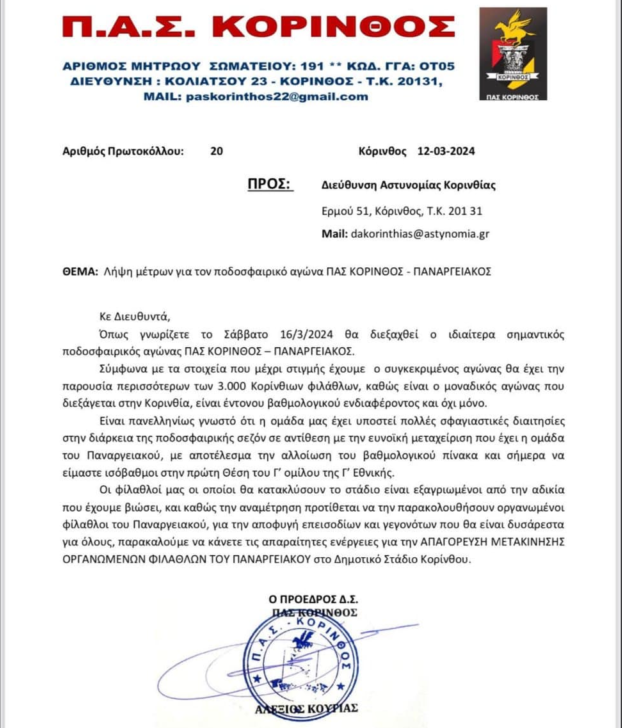 Ένταση έχει δημιουργηθεί ενόψει του μεγάλου αγώνα μεταξύ του ΠΑΣ Κορίνθου και του Παναργειακού, με την πρώτη ομάδα να καταθέτει επίσημο αίτημα για την απαγόρευση μετακίνησης των οργανωμένων φιλάθλων της δεύτερης.