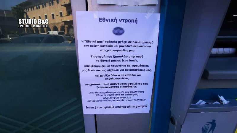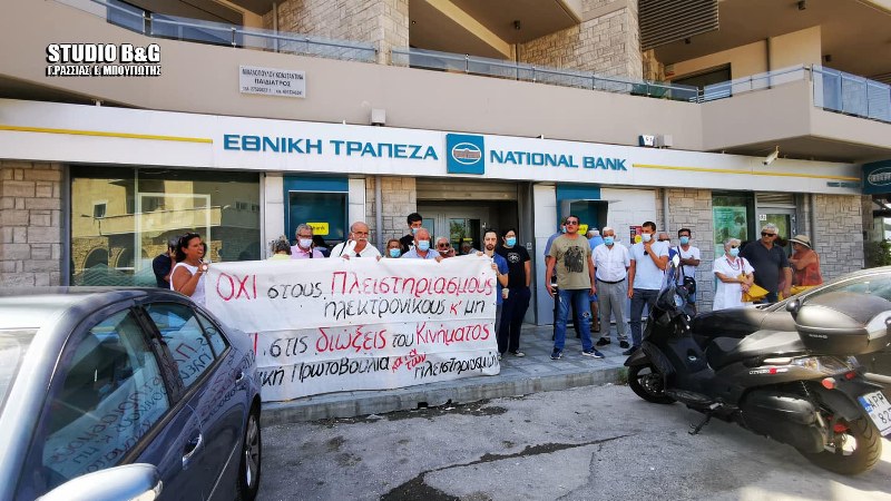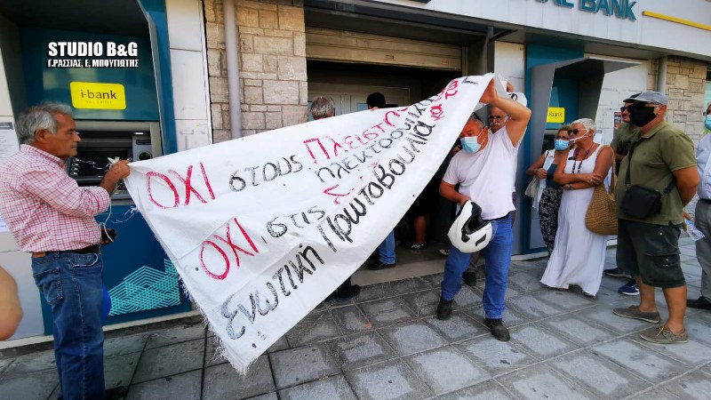Διαμαρτυρία έξω από το υποκατάστημα της Εθνικής Τράπεζας στο Ναύπλιο με συμβολικό αποκλεισμό της εισόδου,