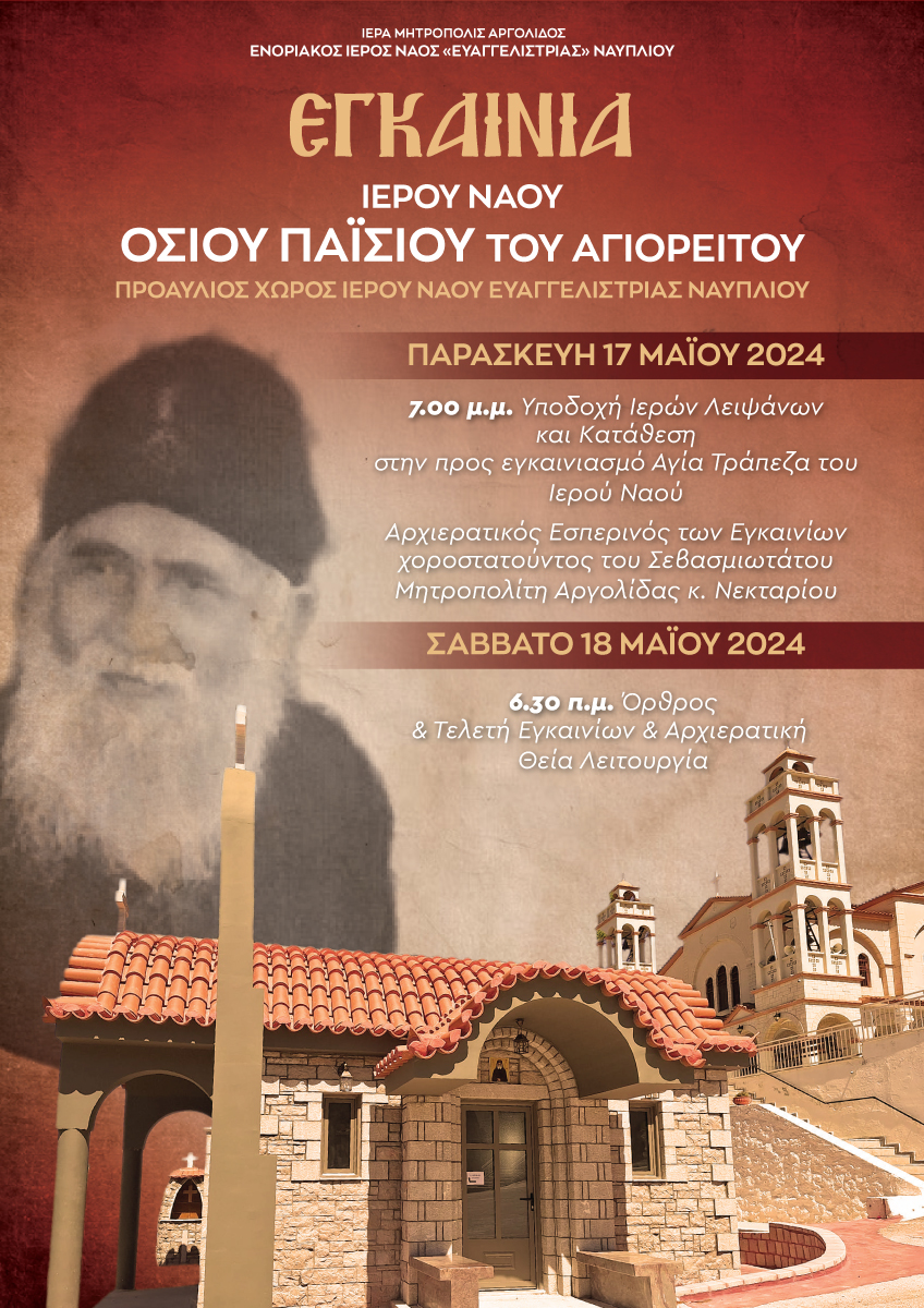 Κάλεσμα στα πλαίσια των εγκαινίων της παρεκκλησίου που είναι αφιερωμένο στον Άγιο Παΐσιο, στην Ευαγγελίστρια Ναυπλίου, απευθύνει ο εφημέριος του Ιερού Ναού.