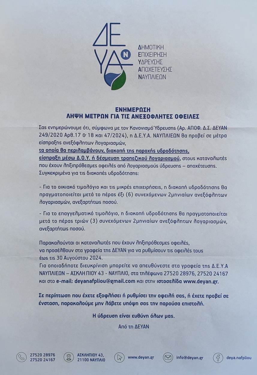 “Σας ενημερώνουμε ότι, σύμφωνα με τον Κανονισμό Ύδρευσης (Αρ. ΑΠΟΦ. Δ.Σ. ΔΕΥΑΝ 249/2020 Αρθ.17 & 18 και 47/2024 ) , η Δ.Ε.Υ.Α. ΝΑΥΠΛΙΕΩΝ θα προβεί σε μέτρα είσπραξης ανεξόφλητων λογαριασμών , τα οποία θα περιλαμβάνουν, διακοπή της παροχής υδροδότησης, είσπραξη μέσω Δ.Ο.Υ. ή δέσμευση τραπεζικού λογαριασμού , στους καταναλωτές που έχουν ληξιπρόθεσμες οφειλές από λογαριασμούς ύδρευσης – αποχέτευσης .