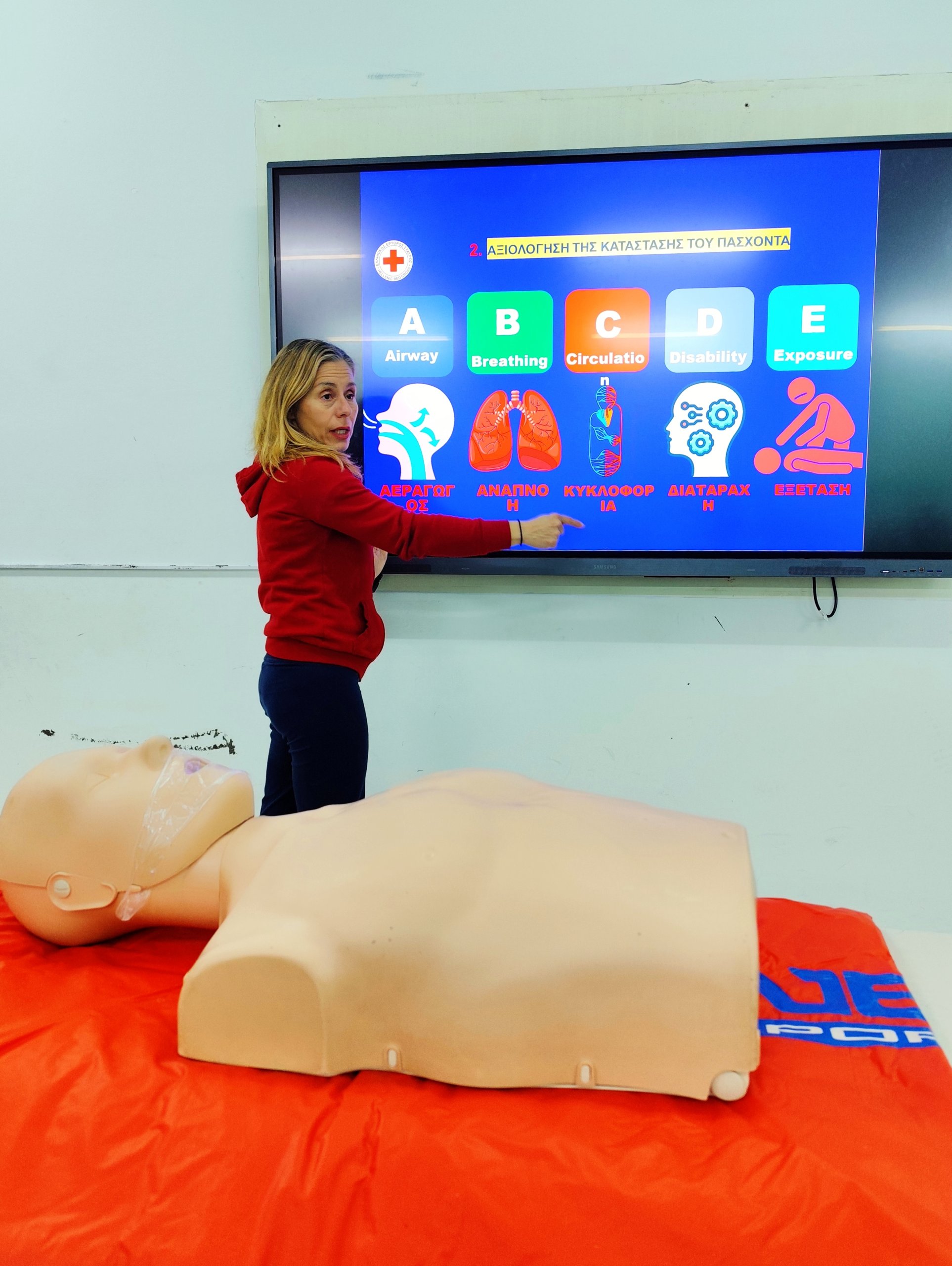 Στο πλαίσιο αυτό, το σχολείο είχε την τιμή να φιλοξενήσει την εκπαιδεύτρια του Τομέα Υγείας του Περιφερειακού Τμήματος Ε.Ε.Σ. Ναυπλίου, Τζένη Παππά, η οποία παρουσίασε με κατανοητό και πρακτικό τρόπο τη σωστή διαδικασία παροχής Πρώτων Βοηθειών, δίνοντας έμφαση στην ΚΑΡΠΑ (καρδιοπνευμονική αναζωογόνηση) και στη χρήση εξωτερικού απινιδωτή.