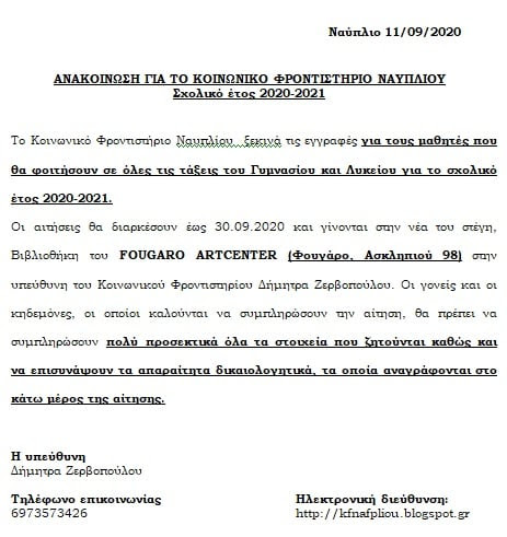 Tο Κοινωνικό Φροντιστήριο Ναυπλίου ξεκινά τις εγγραφές για τους μαθητές που θα φοιτήσουν σε όλες τις τάξεις του Γυμνασίου και Λυκείου για το σχολικό έτος 2020-2021.