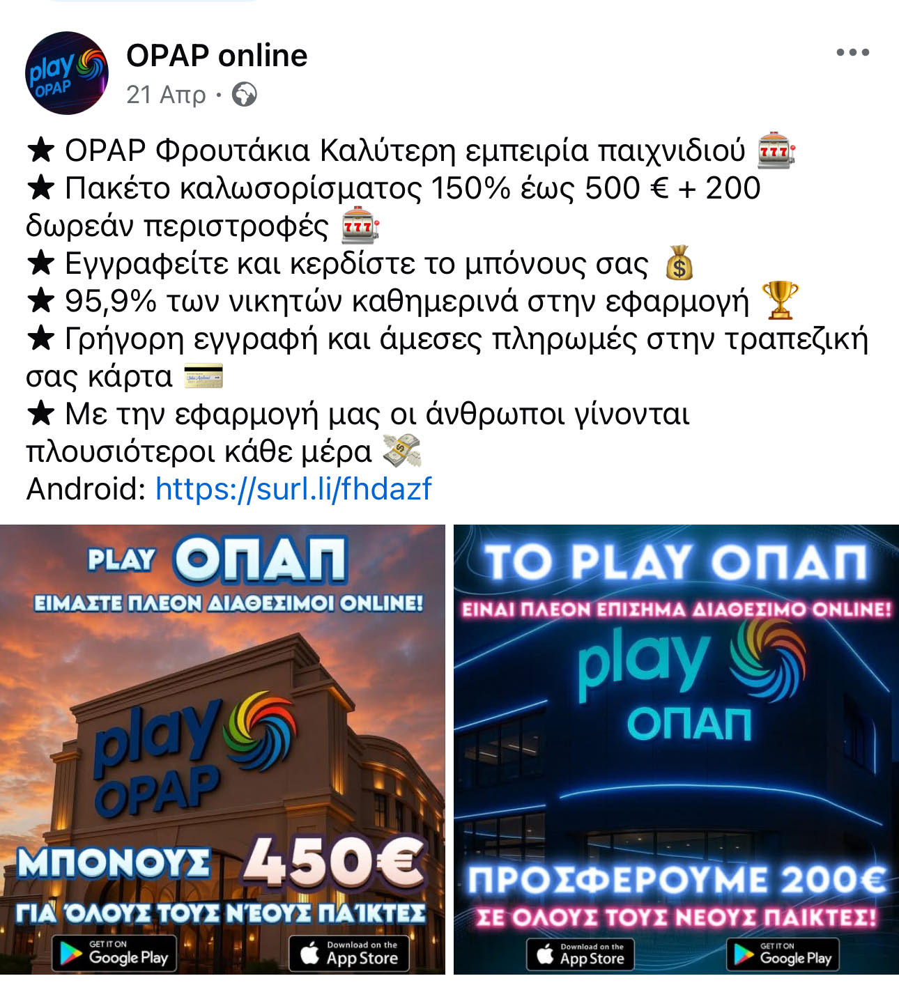 Σοβαρή απάτη έχει εντοπιστεί το τελευταίο διάστημα στην Αργολίδα, μέσω ψεύτικων διαφημίσεων που εμφανίζονται σε μέσα κοινωνικής δικτύωσης και παραπέμπουν σε διαδικτυακά «φρουτάκια» και παιχνίδια τύπου ΟΠΑΠ Play.