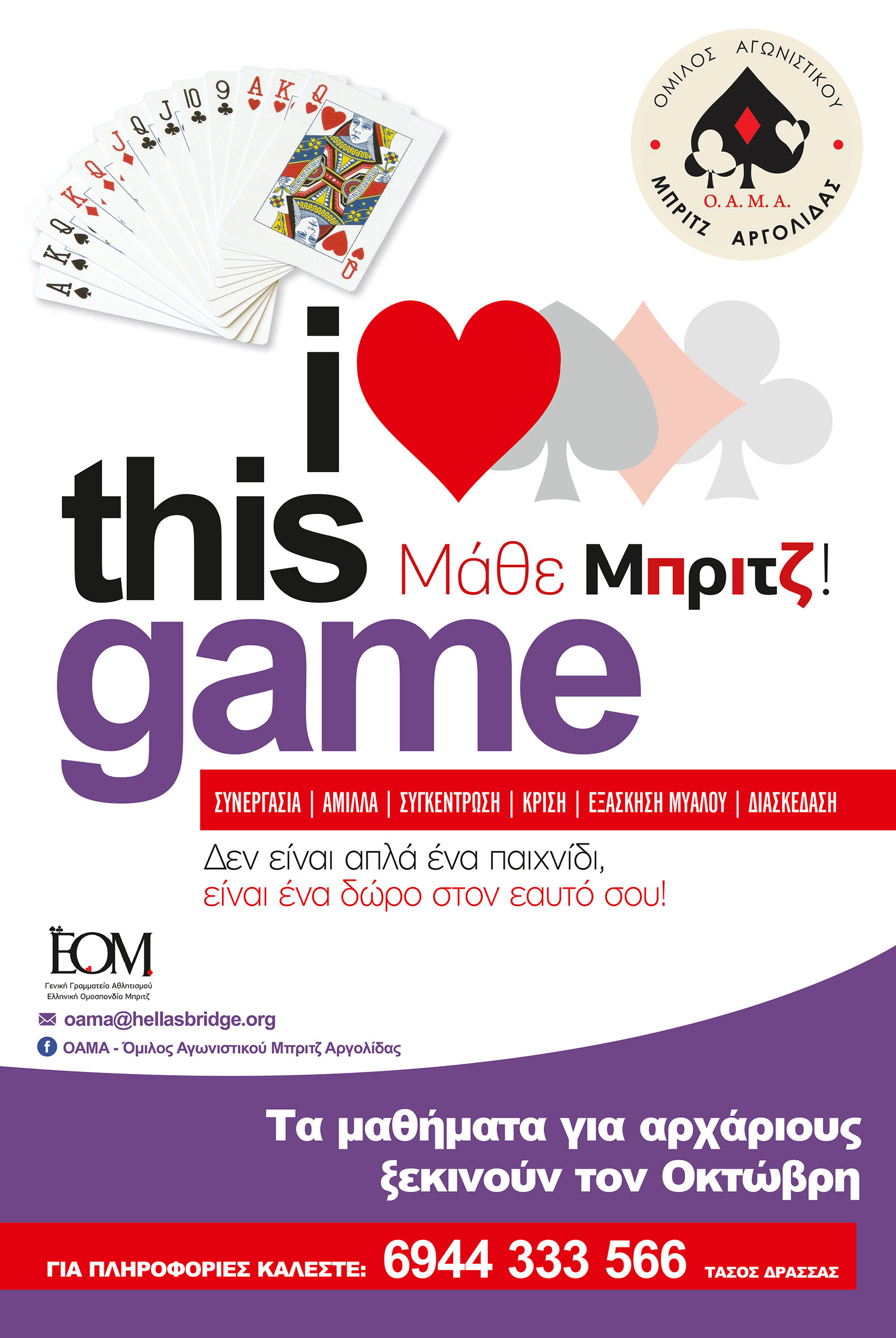 Μαθήματα μπριτζ ξεκινούν κάθε χρόνο τον Οκτώβριο και τον Ιανουάριο από τον Όμιλο Αγωνιστικού Μπριτζ Αργολίδας (ΟΑΜΑ). Έκτακτα γκρουπ μπορούν να ξεκινήσουν καθόλη τη διάρκεια του έτους, μετά από συνεννόηση με τον κ. Τάσο Δράσσα (6944333566).