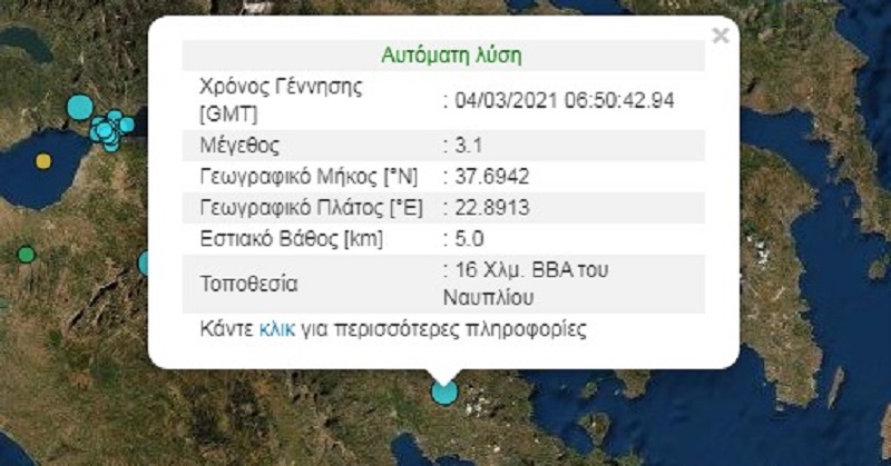 Σεισμική δόνηση μικρής έντασης που έγινε όμως αισθητή, σε αρκετές περιοχές της Αργολίδας, σημειώθηκε στις 8:50 το πρωί της Πέμπτης 4 Μαρτίου