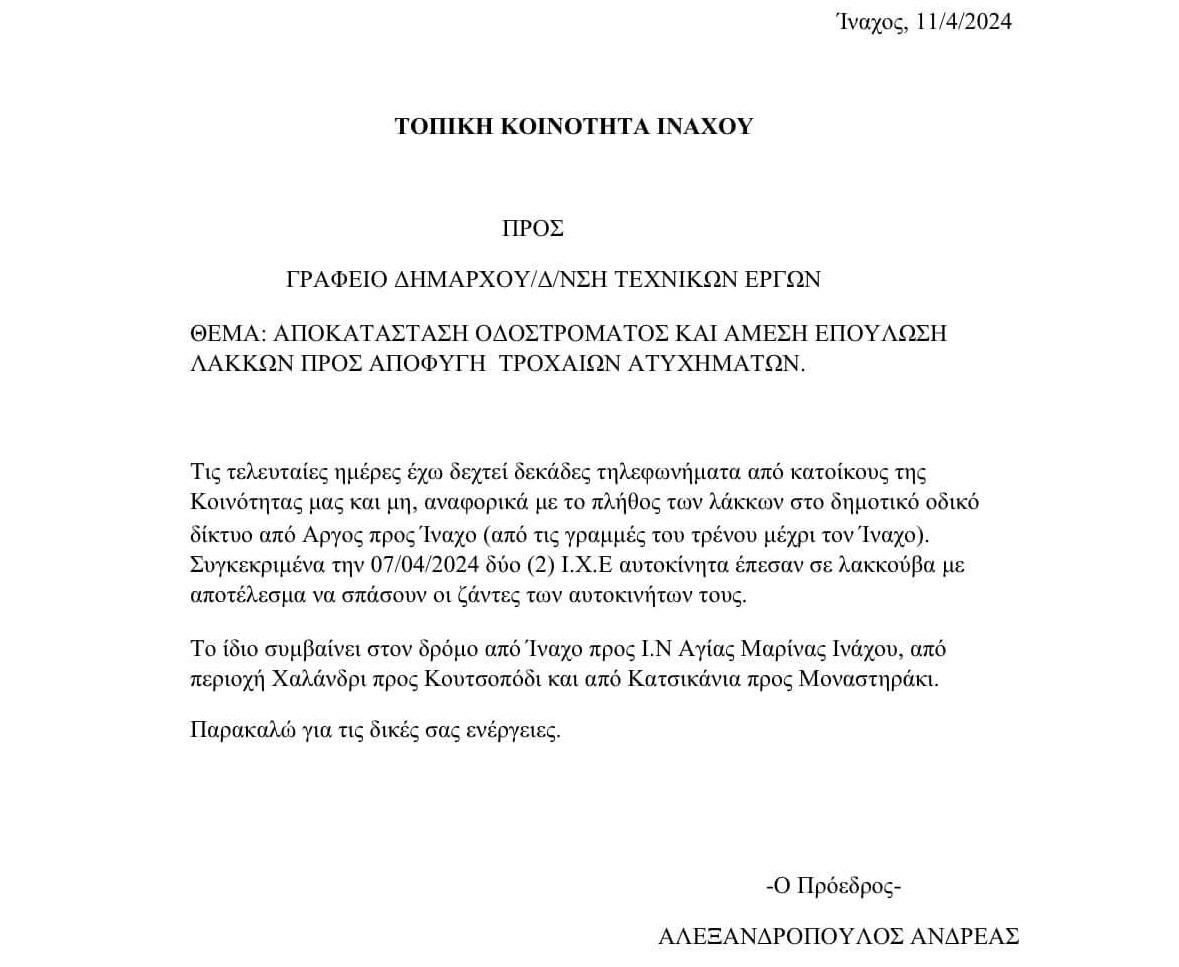 Να σημειωθεί ότι ο Πρόεδρος της Τοπικής Κοινότητας Ινάχου, Ανδρέας Αλεξανδρόπουλος, με επιστολή του στις 11 Απριλίου 2024 προς το γραφείο του Δημάρχου Άργους Μυκηνών και τη Διεύθυνση Τεχνικών Έργων του Δήμου, είχε ενημερώσει για την κακή κατάσταση του οδοστρώματος και τον κίνδυνο πρόκλησης ατυχήματος. Παρά την προειδοποίηση, δεν υπήρξε καμία ενέργεια για την επισκευή του δρόμου, γεγονός που τελικά οδήγησε στο ατύχημα.